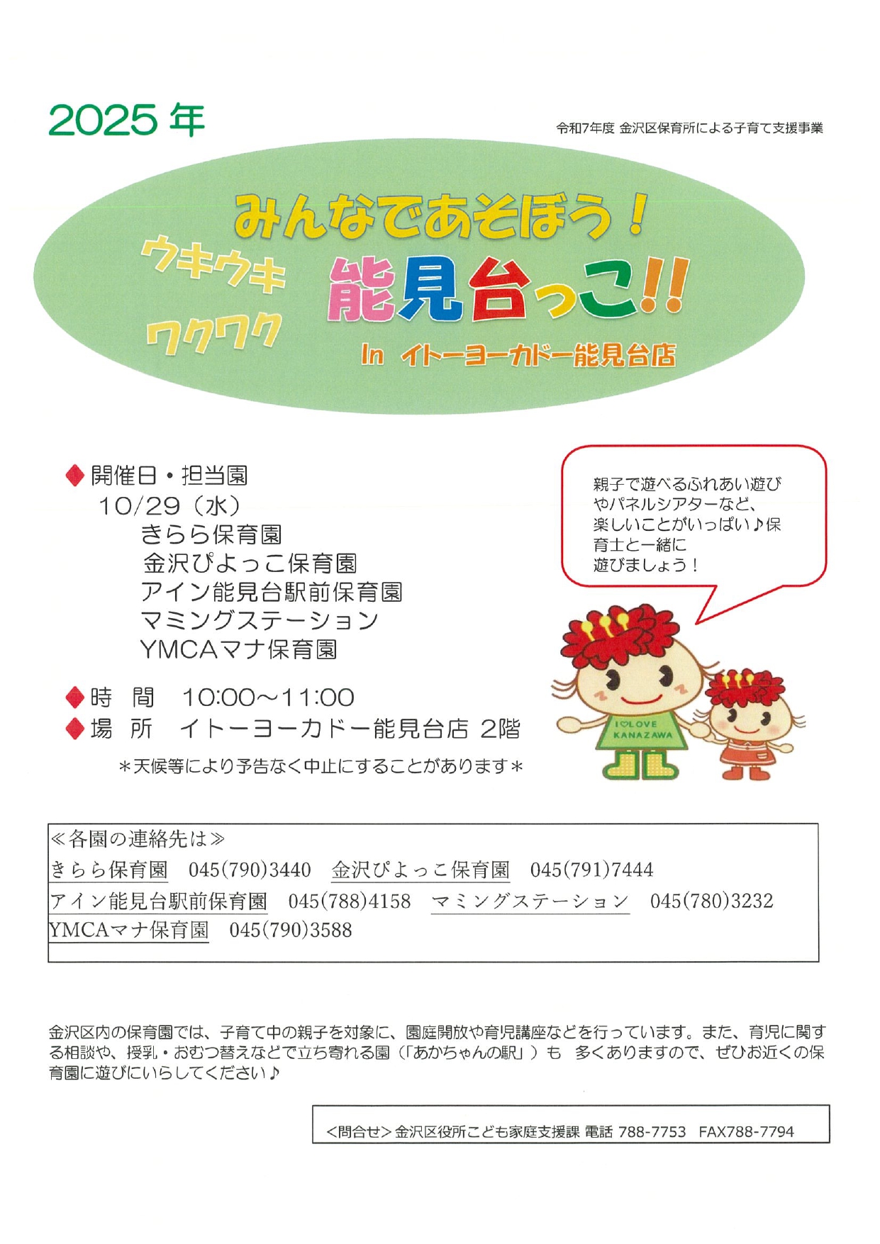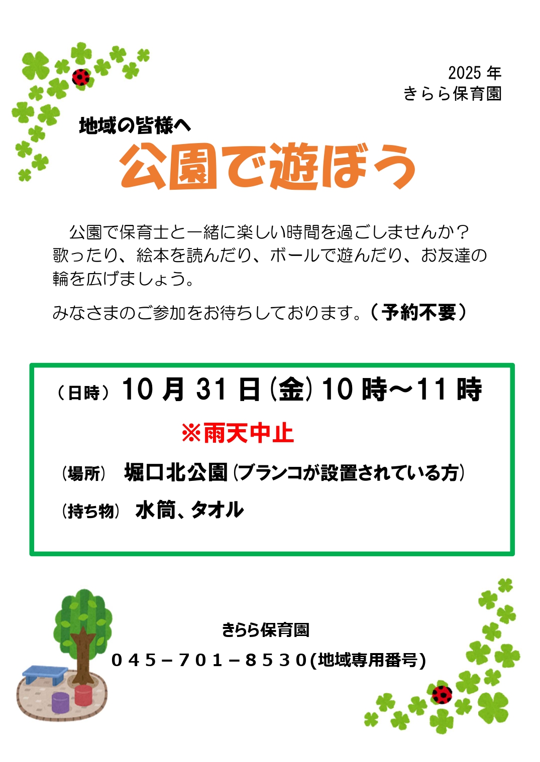 2025年3月28日(金)の公園であそぼうは雨天の為中止させていただきます。