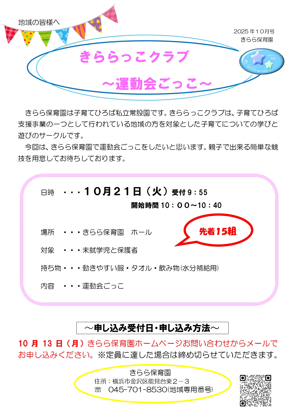 10月21日(火)のきららっこ運動会ごっこは定員に達したため締切りました。